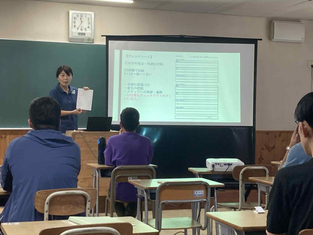 一日のプログラムでは一分エクササイズが増えたり、チェックシートに一日一善の記入欄が加わったり、今年度は特に健康管理を可視化できるようにシートをつけていくなどをやっていきます。