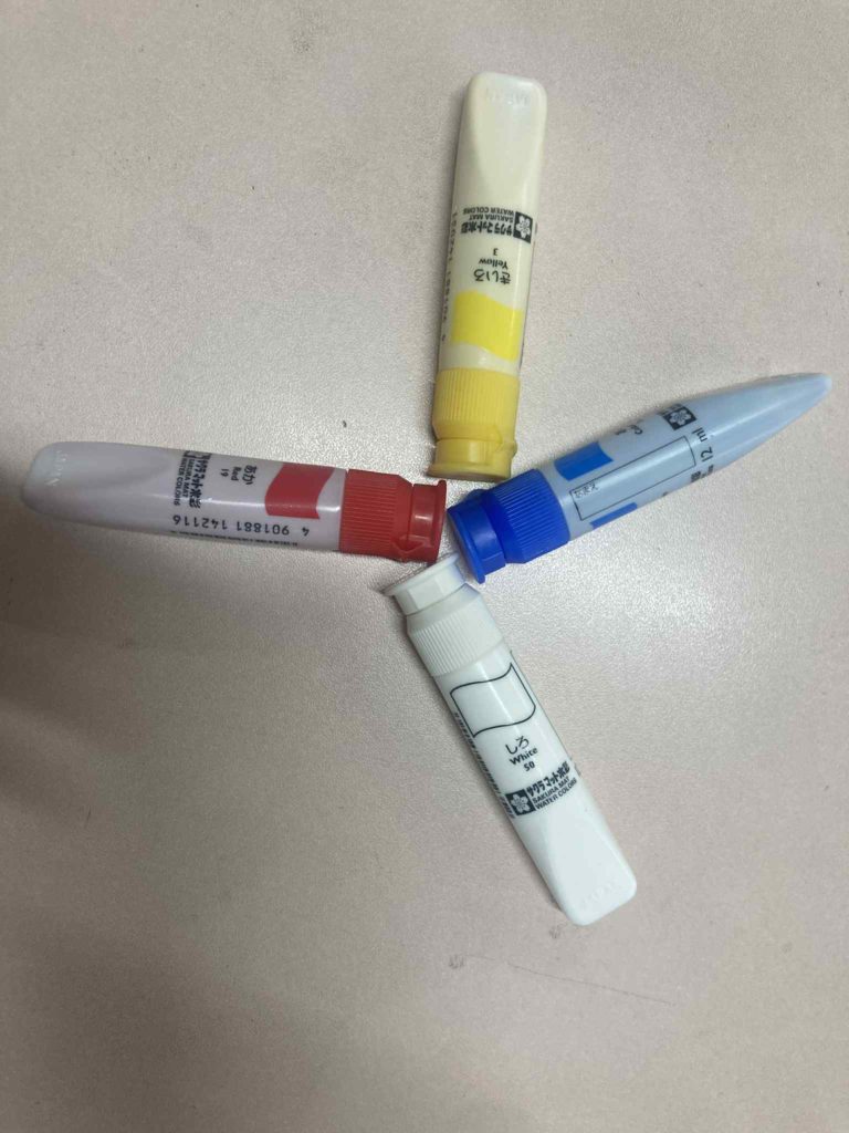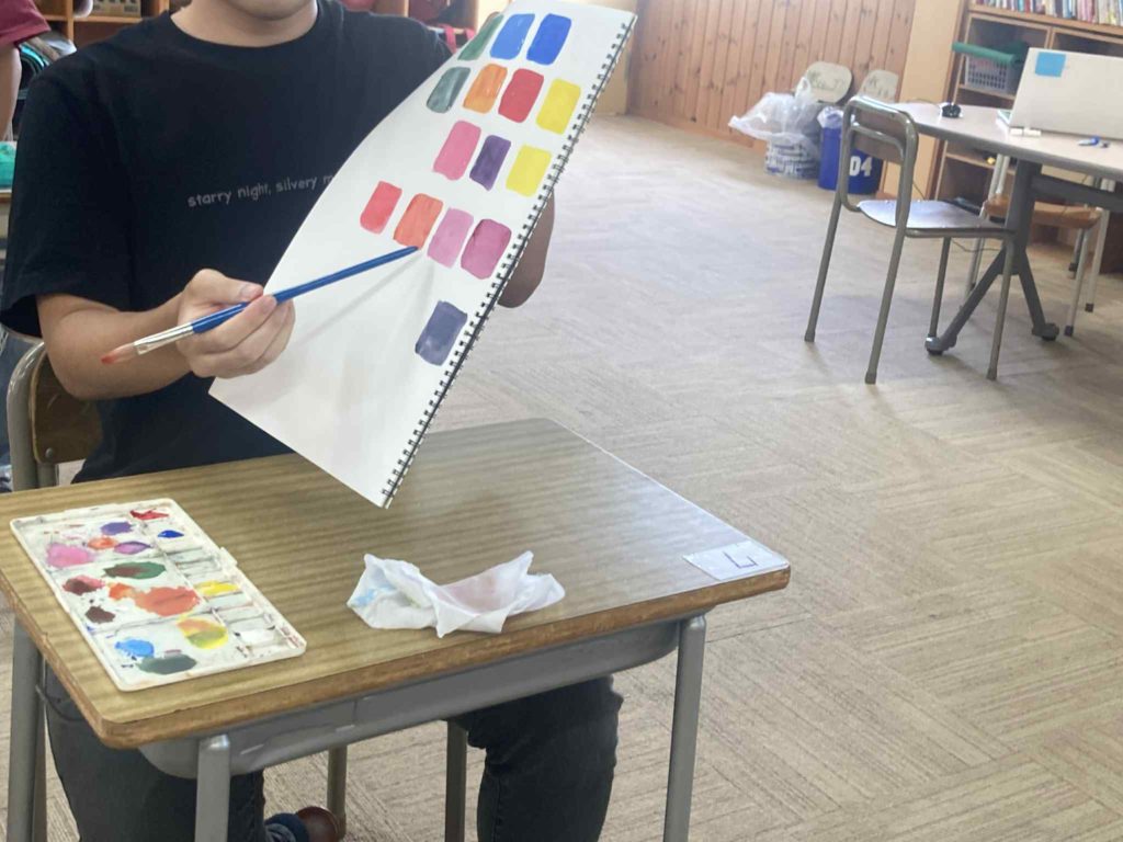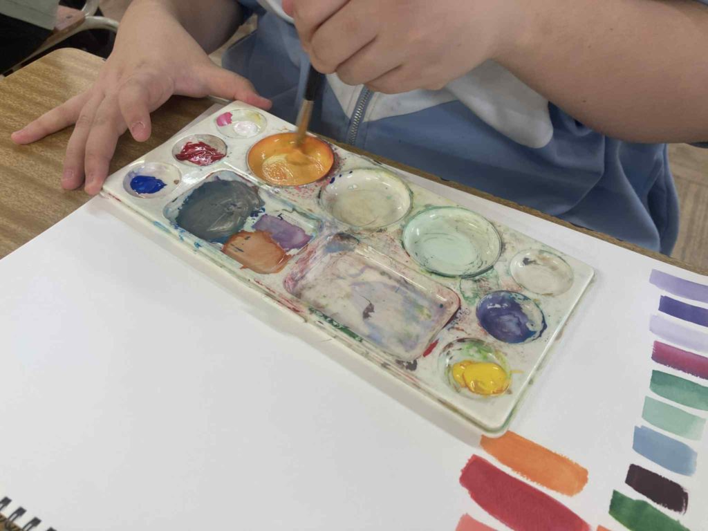 赤・青・黄の三つの絵具をつかって、今日は色づくりを楽しみました。