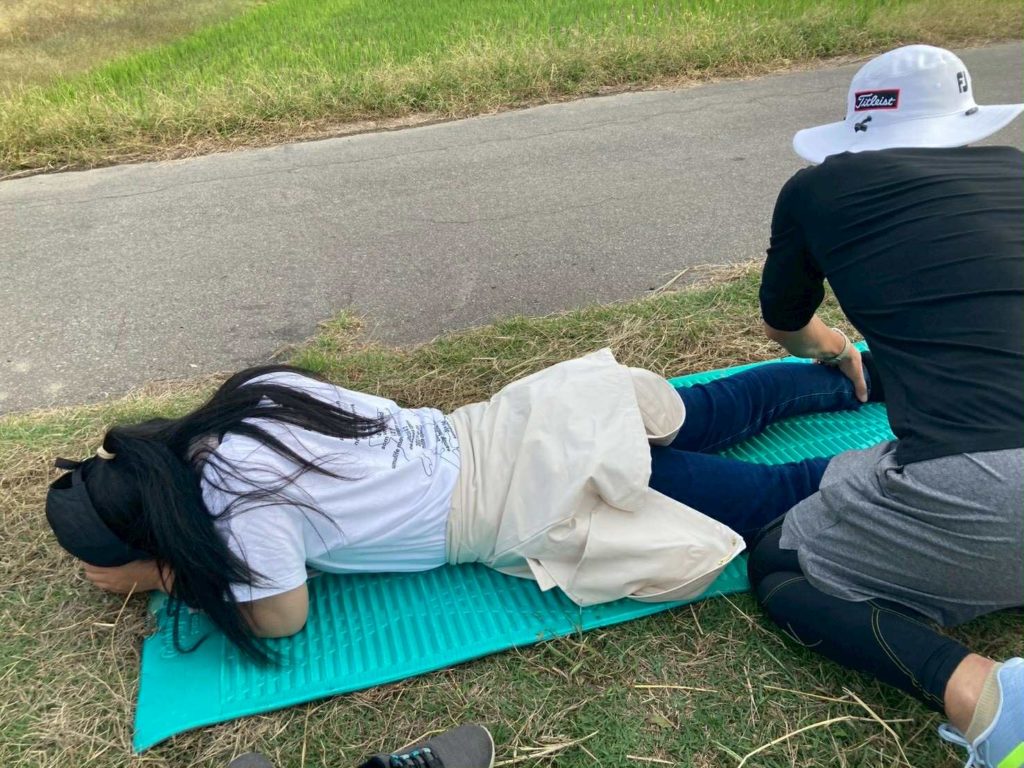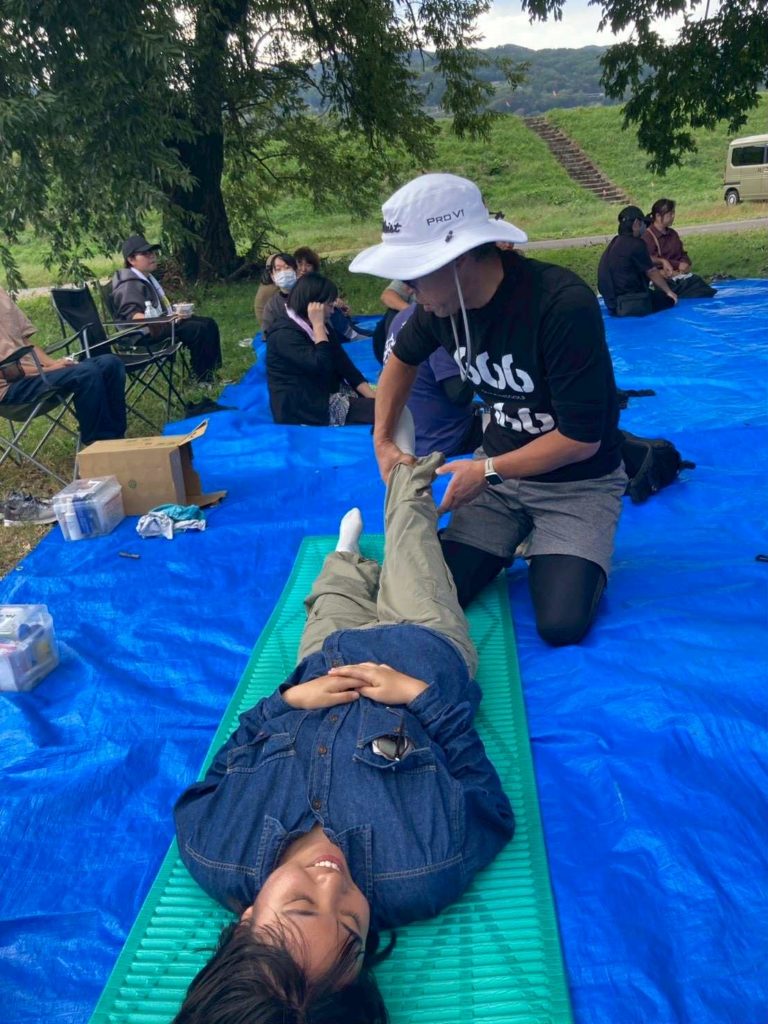千曲市にあります千曲橋の休憩所あたりから、身体の不調が出始め、身体のマッサージを受けつつ、歩く生徒が出始めます。