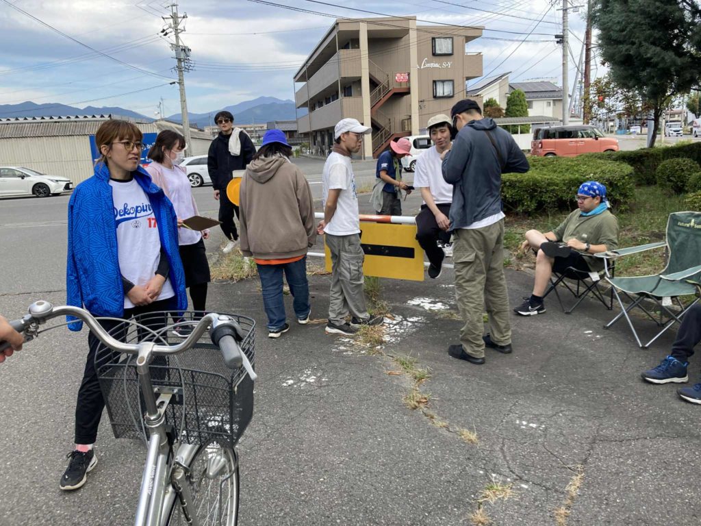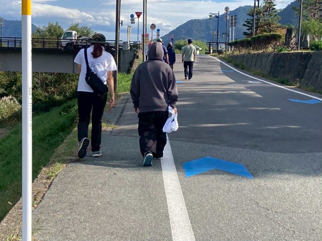 お昼は、昼食場所の平和橋近くの河川敷で食べます。お弁当のほか弁を保護者の皆さんやスタッフが届けてくれました。お弁当のほかに、フルーツやお菓子を食べながらしばし休憩です。善光寺の出発が少し遅れたものの、生徒たちの歩くペースが速く予定を上回るペースです。