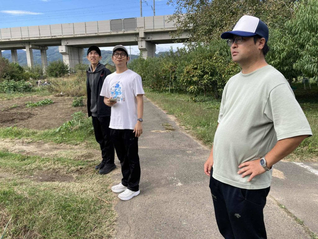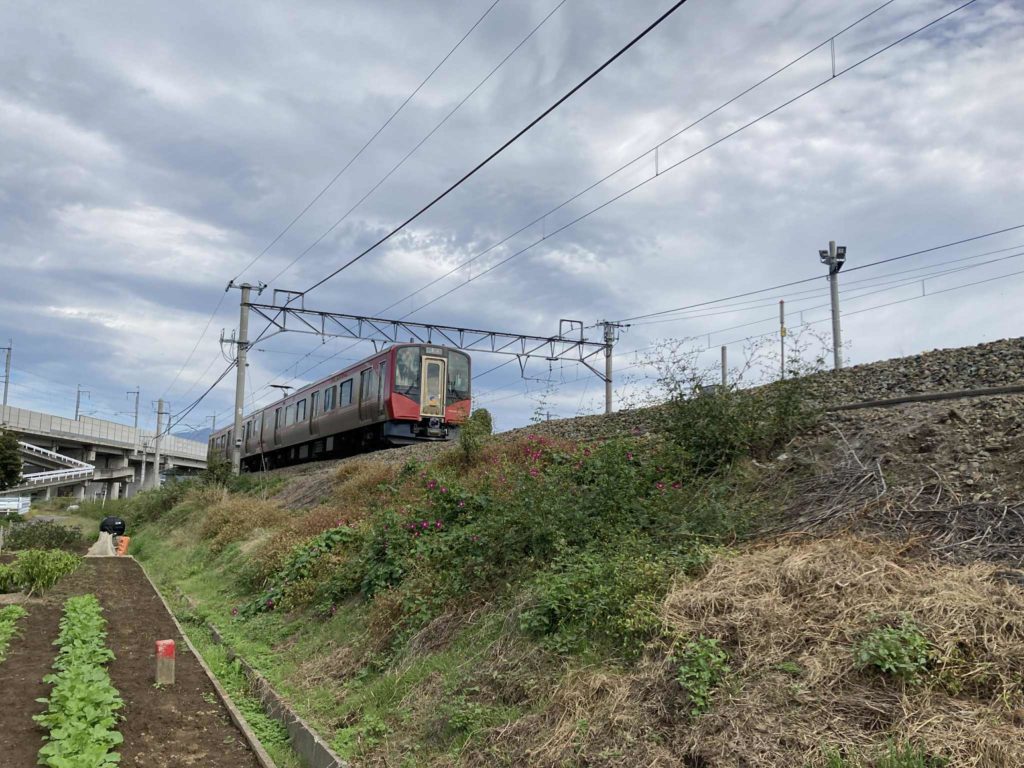 遠足の道中の高校に通っていた生徒が、「撮り鉄」の撮影の穴場スポットだと教えてくれました。ちょうど電車が通り1枚撮影しました。それを眺める男性3人です。