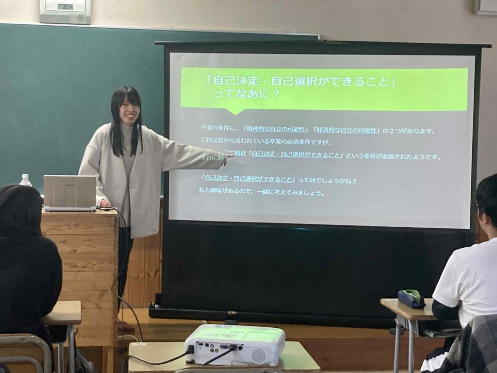 Her talk centered on self-choice and self-determination, one of the essential graduation goals at Samugaku. She spoke about the subtle but important gap that often exists between how students view themselves and how staff members view them — their current position, as she called it.