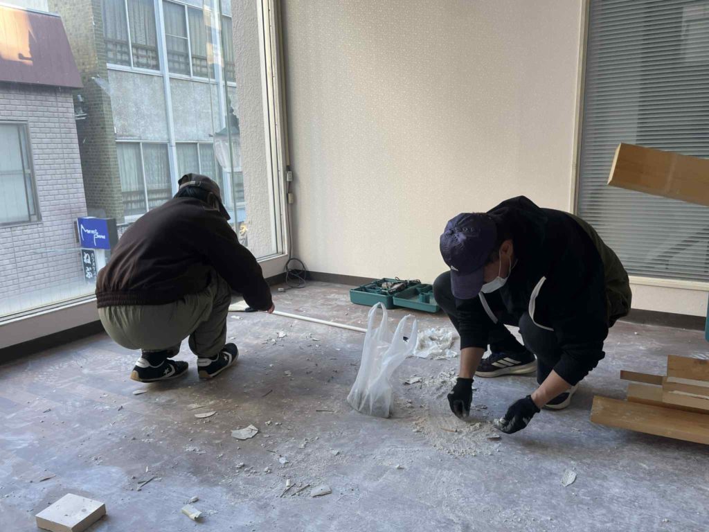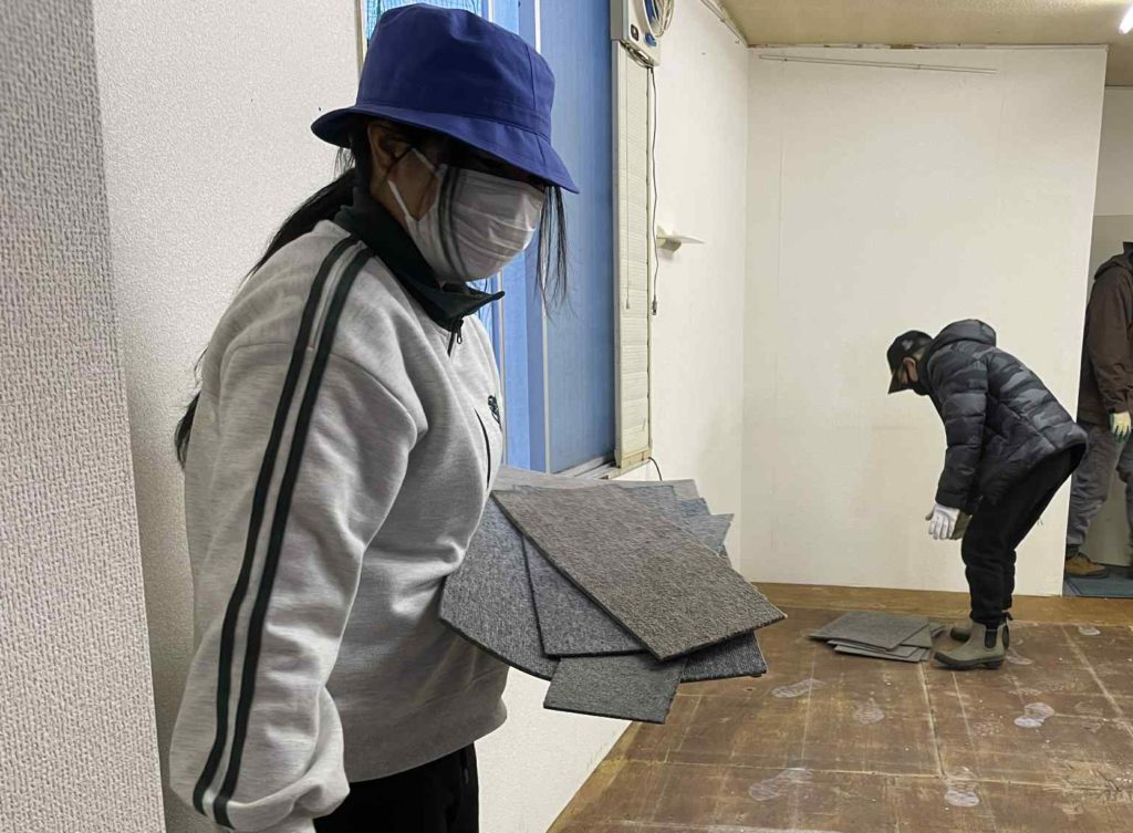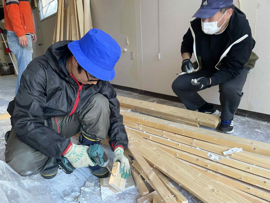ビスを抜いたり、カーペットをはがしたり、木材を運んだり。