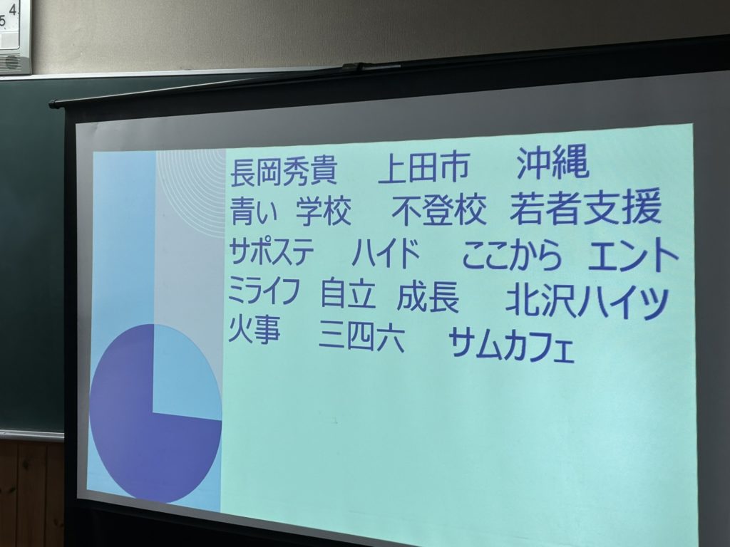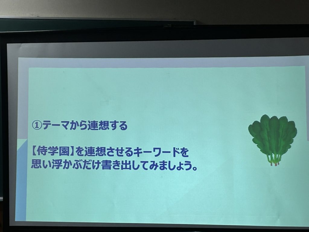 「分かりにくいことを分かりやすい言葉に変換して伝える」というワークでは「侍学園」という言葉から連想するキーワードを書き出し、「侍学園」という、なんだかよくわかんない学校を、サムガクを知らない人に別の言葉を使って説明するという練習をしました。連想ワードがどんどん出てきました!