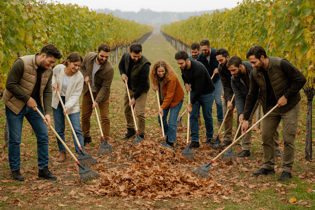 まずは「ブドウ畑で9人がレーキを使って落ち葉を集めている」