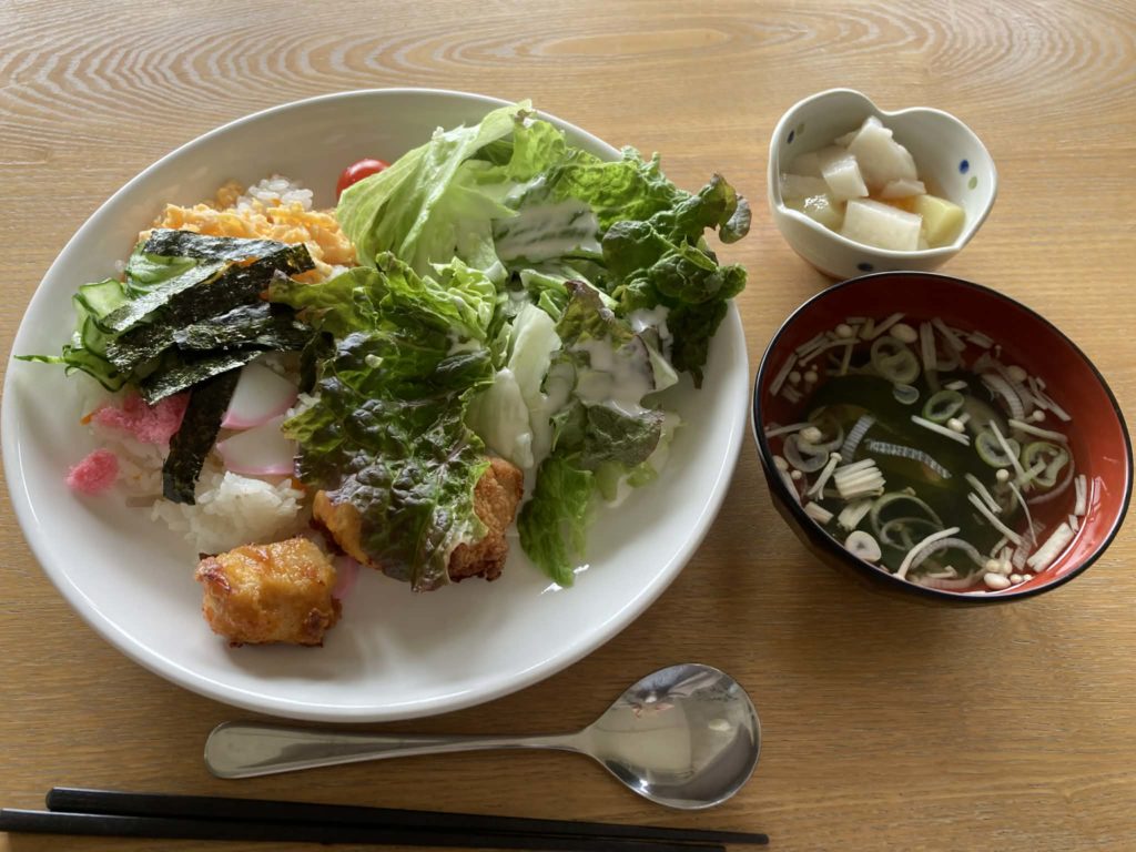 ちらし寿司とデザートには甘酒フルーツ寒天がうれしいです。