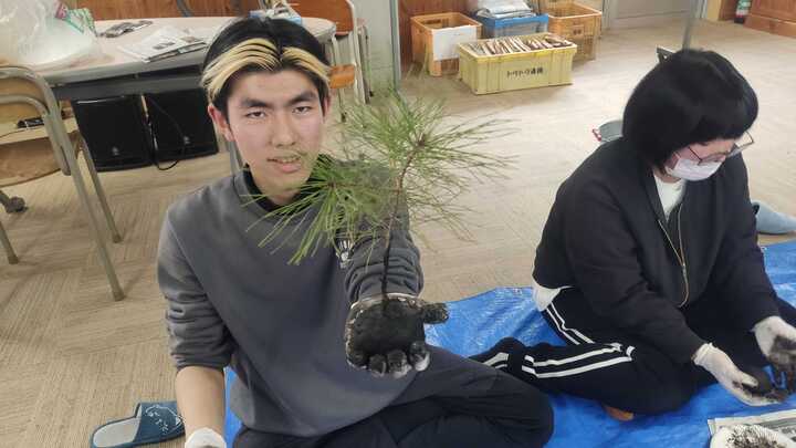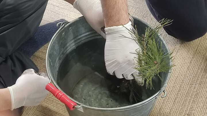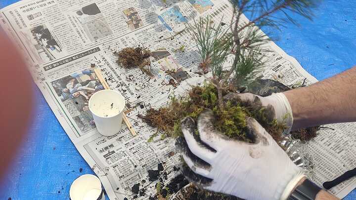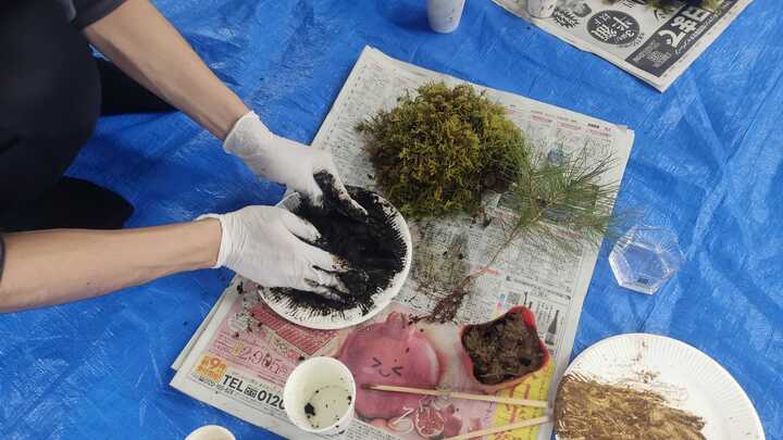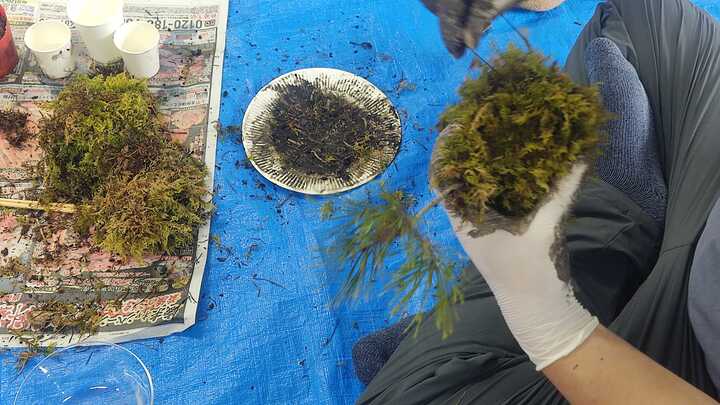 松などの植物を選び、根を傷つけないように土を落とし、赤玉土とケト土(保水性や粘り気が高い)をブレンドしてで秘伝の土を作ります。