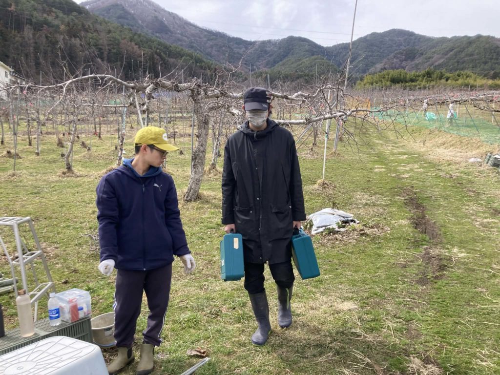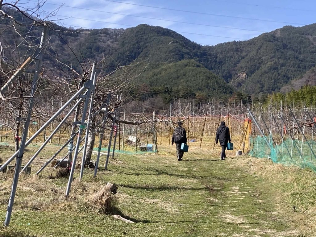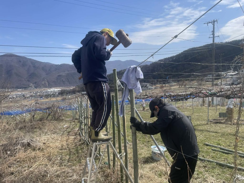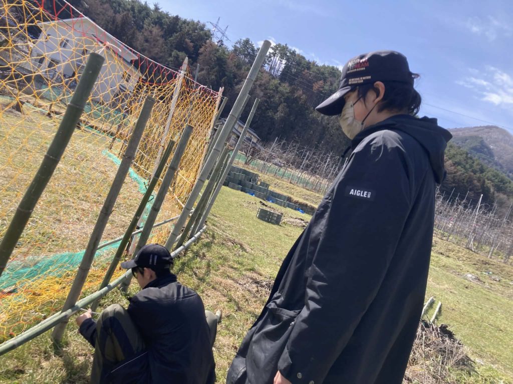 春になって動物たちも活動が活発になるので、ぶどうやリンゴを主に野生のシカから守るため防護柵を作りました。