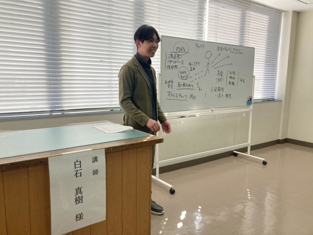 講師はキャリアコンサルタント、ジョブカフェ信州就業支援地域アドバイザーの白石真樹氏。今後どのような働き方をしたいかなどを「キャリアデザイン」の視点から学びました。